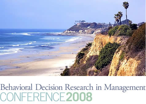 Decision Science News very much enjoyed the last two BDRMs. The 2008 BDRM conference promises to be very good as well, as it is sponsored by the meteorically rising UCSD Rady School of Businsess, and familiar JDM names are running the show: Dave Schkade, Craig McKenzie, Uri Gneezy, and Alan Schwartz.
