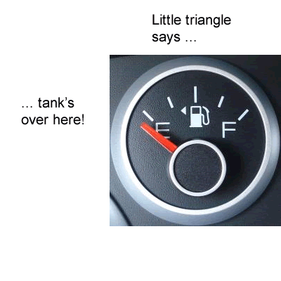Somewhere along the road of life, we at Decision Science News learned that the little triangle next to the fuel gauge points to the gas-cap side of the car.