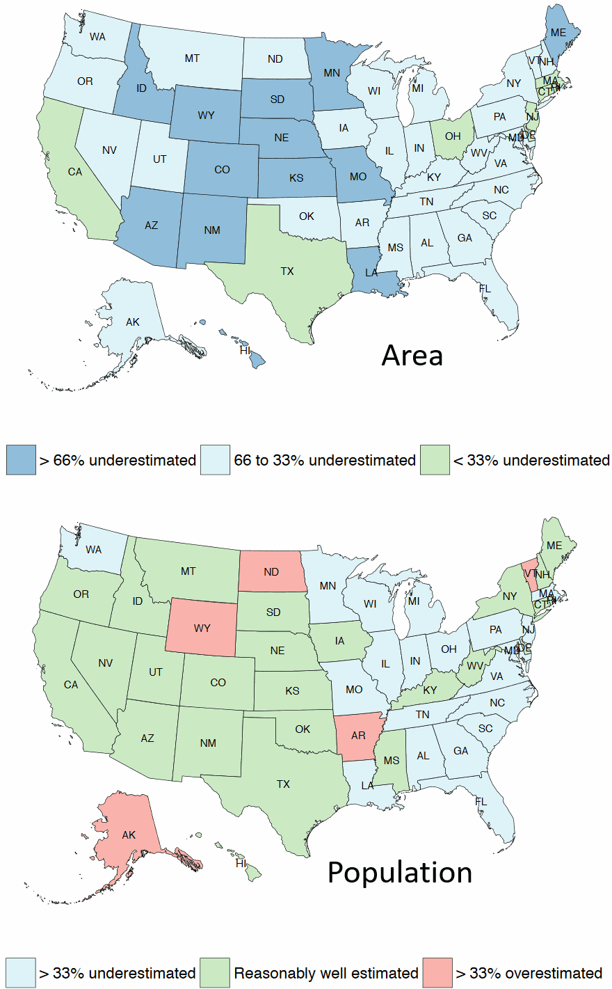 In the course of doing this research, we were able to generate some fun charts like the one at the top of the post. People underestimate the areas of pretty much all US states (above, top panel) but are especially bad at central and Western states. Furthermore, they underestimate the populations of Eastern states (above, bottom panel). The US is tricky for geographic inferences because many big states have small populations. This makes traditional election maps deceptive and have led to some (weird, we know) ways of rescaling them. [BTW, if you are interested in the psychology of demographic estimation, we can recommend Brown and Siegler (1993)].