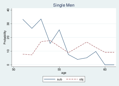 Figure 4 shows the relevant subjective and objective probabilities for this sample, with age on the x-axis and the relevant probabilities on the y-axis. A different picture emerges. There is definitely evidence that this sample of individuals are rational Bayesian learners. This is especially the case with single men, single women and married men, where by age 61 the subjective probability almost completely coincides with the objective probability. In the case of married women, some convergence is present, but it is not complete. This convergence is the case, despite the fact that such individuals start off far less accurate than the those in the sample including focal point respondents. What is important in the rational Bayesian learning paradigm is not the size of the initial bias but rather the fact that the bias decreases over time.