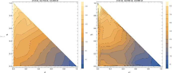 Figure 6: Indifference curves in two Marschak-Machina triangles: Triangle 1 (left) with outcomes x1 = 0 zł, x2 = 150 zł, and x3 = 300 zł; and Triangle 2 (right) with outcomes x1 = 0 zł, x2 = 450 zł, and x3 = 900 zł. The Mathematica® program draws colored contour plots, so that areas of low CE contour values are marked using “cold” colors, and areas of high contour values are marked using “warm” colors.