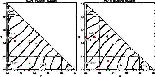 Finally, and most importantly for the present study, the indifference curves appear to have jumps in the direction of the origin near the legs of the triangle. Significantly, these jumps are not observed near the hypotenuse.