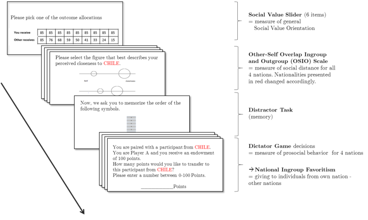 The core dependent measure national in-group favoritism concerning prosocial behavior was assessed using a dictator game (DG), and the predictors social preferences and social distance were measured using the Social Value Slider (SVS) measure (Murphy, Ackermann & Handgraaf, 2011) and the Overlap of Self-In-group (OSI) and Overlap of Self-Out-group (OSO) Scales (Aron, Aron & Smollan, 1992), respectively. The within-subjects manipulations of the receiver nation were realized by playing the DG with a person from four different nations (including the own nation), from which only the nationality was known. OSO was assessed for all three other nations, whereas group-independent social value orientation and OSI were assessed only once. The overall procedure including the individual materials is depicted in Figure 1. Cultural distance was not directly assessed in the experiment, but calculated from previous work as the Euclidean distance between nations based on the six-dimensional model by Hofstede et al. (2010).