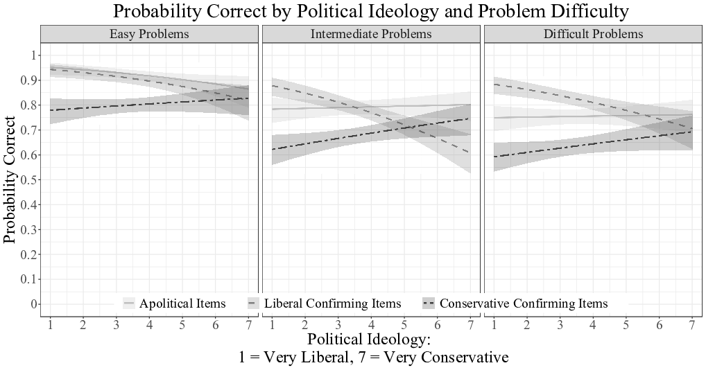 Finally, all 3-way interactions between difficulty, problem-type, and political orientation were not significant, γ s < −0.01, SEs = 0.05, ps > 0.79 (Figure 5). This indicated that problem difficulty did not attenuate the observed pattern of partisan-consistent responses; participants were more likely to answer partisan-confirming items correctly relative to partisan-disconfirming items regardless of how difficult the problems were to solve.
