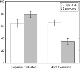 Concerning the question of whether donors to human charities tend to weigh the importance of an attribute in proportion to its ease of evaluation, Figure 2 shows their average donations. Donations in the separate evaluation condition are shown in the left-hand panel. When evaluated separately, independent sample t-tests revealed that subjects donated significantly more to the Low overhead/effectiveness charity (M=78.6, SD=32.5) than they did to the High overhead/effectiveness charity (M=64.6, SD=41.4; t(83)=–1.72, p=.045). To test whether this held when both charities were presented jointly, I report donations in joint-evaluation on the right-hand panel in Figure ??. In this case, subjects donated significantly more to the High overhead/effectiveness charity (M=65.1, SD=30.9) than they did to the Low overhead/effectiveness charity (M=34.9, SD=30.9; paird t-test [t(39)=3.10, p=.002). Thus, donors showed a preference for the Low overhead/effectiveness charity when presented in isolation, whereas when evaluated jointly, donors donated more to the High overhead/effectiveness charity. This observation supports Hsee’s (1996) preference reversal (t(120)=4.53, p=.001), i.e., preferences change when given a reference point (Hsee, 1998; Hsee et al., 1999).8. Furthermore, the results lend support for the hypothesis that donors find overhead to be an easier attribute to evaluate than effectiveness, confirming the existence of the evaluability bias observed by Caviola et al. (2014).